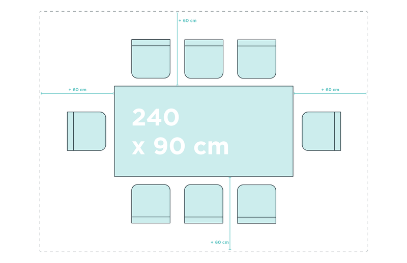 Pour pouvoir placer les chaises autour de la table et s’installer confortablement, laissez au moins 60 cm de libre tout autour.