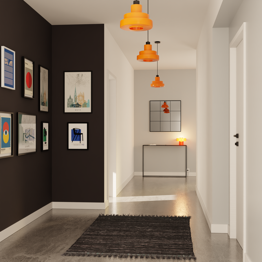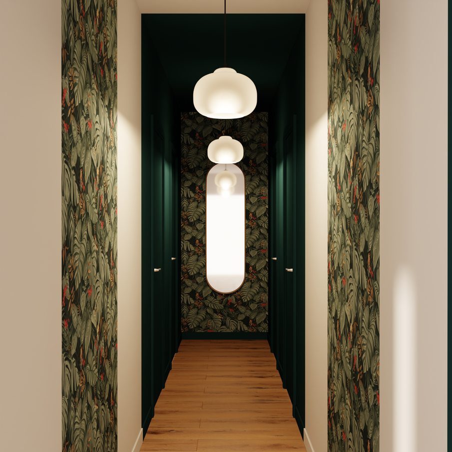 Dans un couloir trop long, privilégiez les teintes profondes comme le bleu nuit, le bleu pétrole, le vert forêt ou la terracotta. Appliquez les couleurs plus foncées au fond de cet espace de circulation pour le raccourcir visuellement. Les grands motifs floraux, les feuillages et les trompe-l’œil renforcent l’effet. Le mur du fond peut se peindre ou se tapisser dans une teinte plus foncée que les murs latéraux. Pour la déco, des appliques en laiton brossé ou noires mates et des cadres sobres accentueront un style de déco urbain et casual.