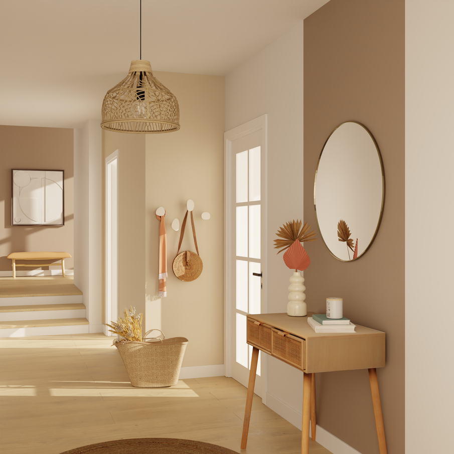 La palette naturelle est à privilégier dans un style de déco minimaliste et épuré. On retrouve le blanc chaud, le gris clair, le beige nude et le lin naturel. Choisissez une couleur et déclinez-la en dégradé. Évitez les motifs, à moins qu’ils ne soient très fins ou en ton sur ton. Des objets déco en bois clair (un banc, des patères ou des cadres par exemple) s’intègrent parfaitement dans ce style de décoration de couloir.