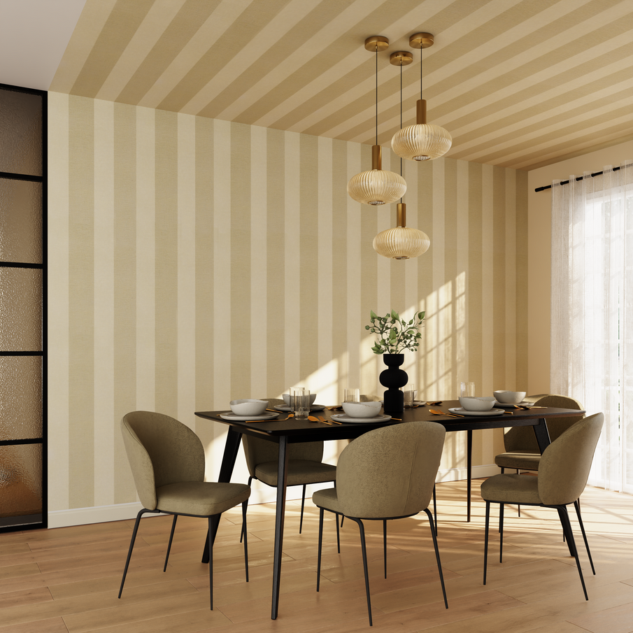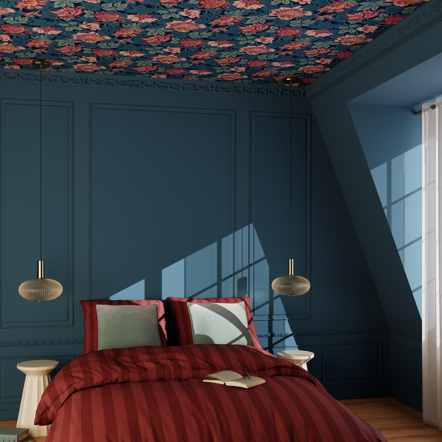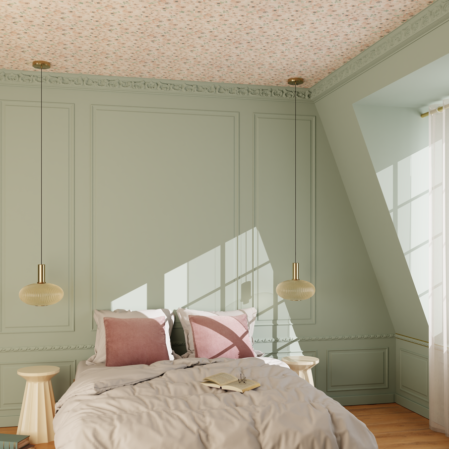 Le papier peint au plafond est particulièrement efficace pour délimiter un espace (coin repas, entrée, tête de lit) ou pour donner une identité forte à une pièce.