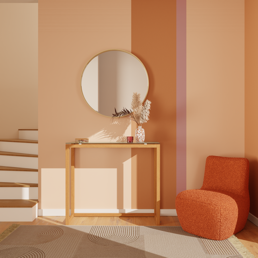 Idéal pour une chambre d’adulte, une entrée chaleureuse ou même un petit bureau, ce trio s’utilise facilement : un mur nude, un fauteuil rose pastel et quelques accessoires couleur caramel suffisent à installer une ambiance élégante et harmonieuse.
