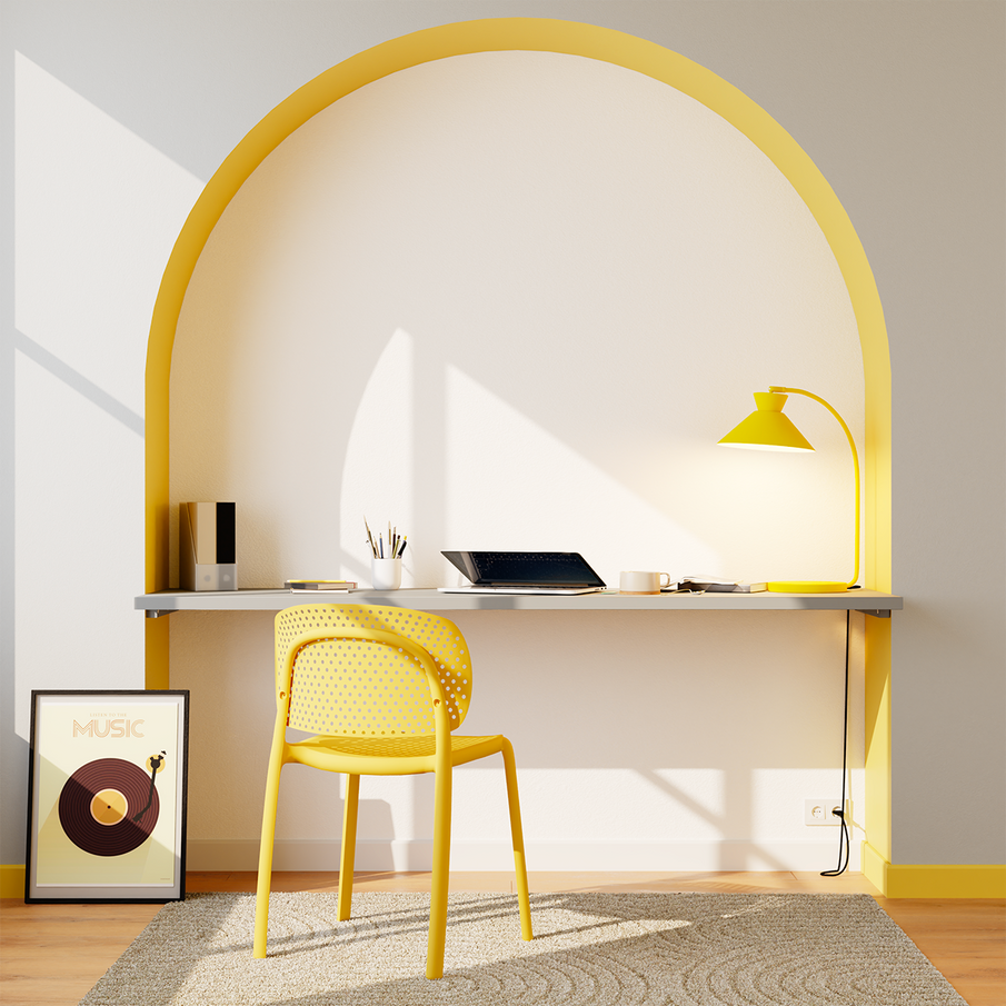 Pour l’aménagement, optez pour un mobilier blanc ou gris perle et réservez le jaune en touches stratégiques : un pan de mur, une lampe à poser de bureau, ou encore de la déco murale jaune (cadres, affiches, étagères). Ces accents colorés apportent du rythme et renforcent la luminosité.