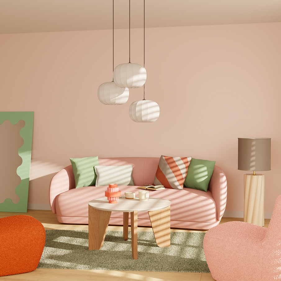 Rose blush + Vert céladon + Corail : vitaminé et ludique dans un salon