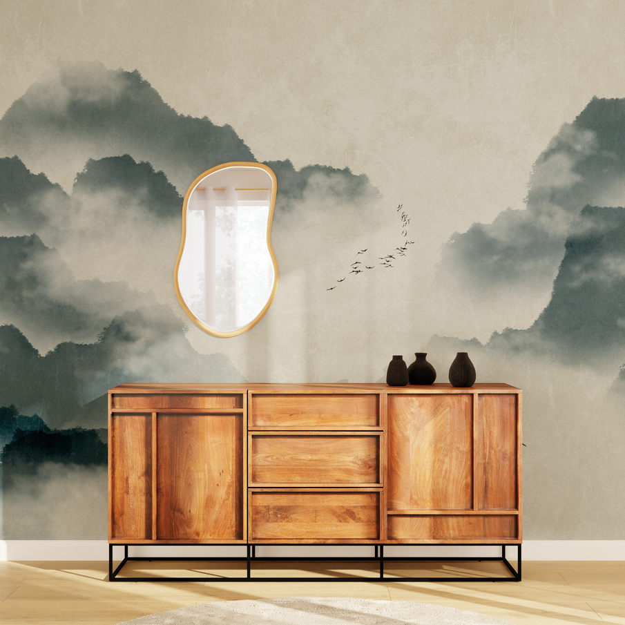 Dans un intérieur Japandi, le papier peint ne cherche pas à voler la vedette, mais à poser l’ambiance. Un papier peint effet matière façon lin ou enduit discret, ou un papier peint panoramique inspiré de paysages flous, mais apaisants : voilà de quoi donner de la profondeur à la pièce sans en faire trop.