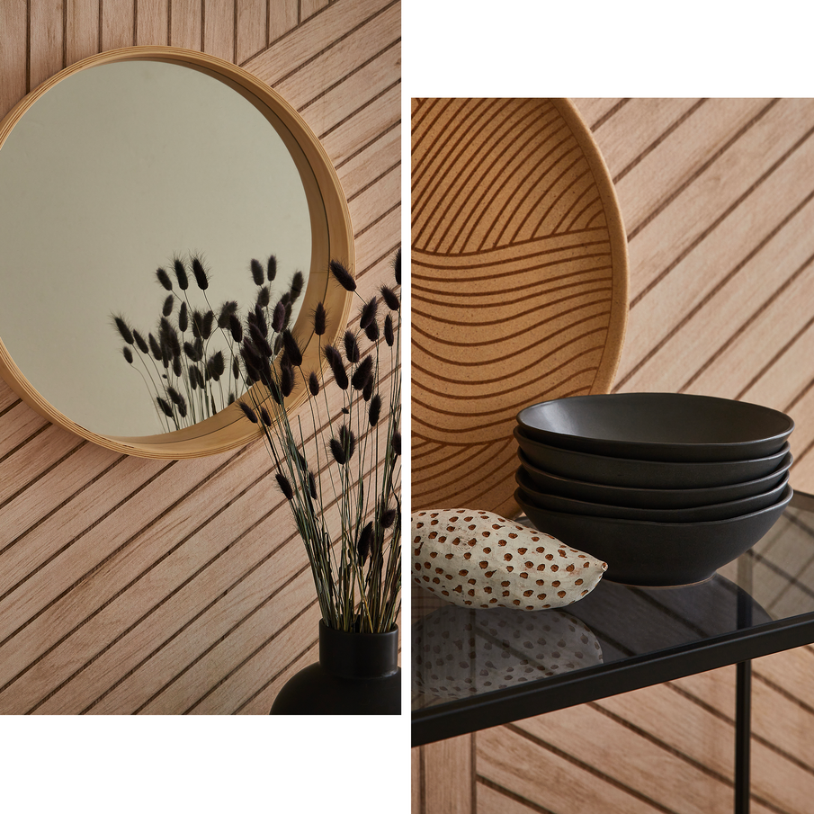 La tendance Japandi aime les lignes épurées, mais pas rigides pour autant. Courbes arrondies, formats asymétriques, détails imparfaits : les objets vivent, respirent, vibrent. Ces petites irrégularités pleines de charme font écho à la philosophie wabi-sabi, souvent associée à cet univers déco, où l’imperfection célèbre la nature et le travail de la main. On pense notamment aux tables ovales, aux miroirs galets ou aux vases bombés.